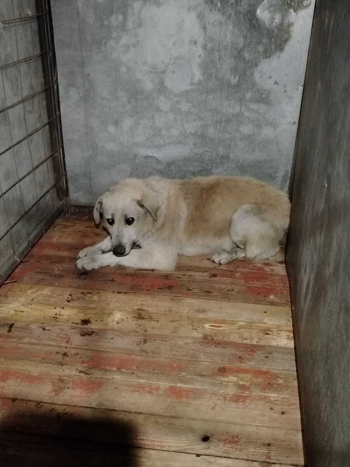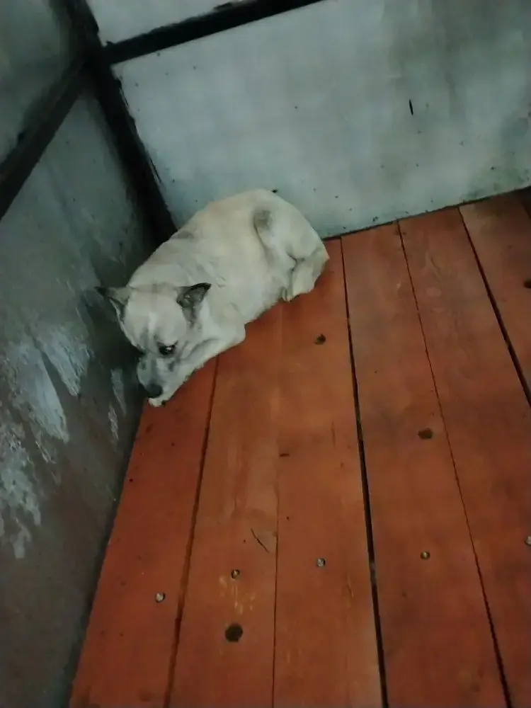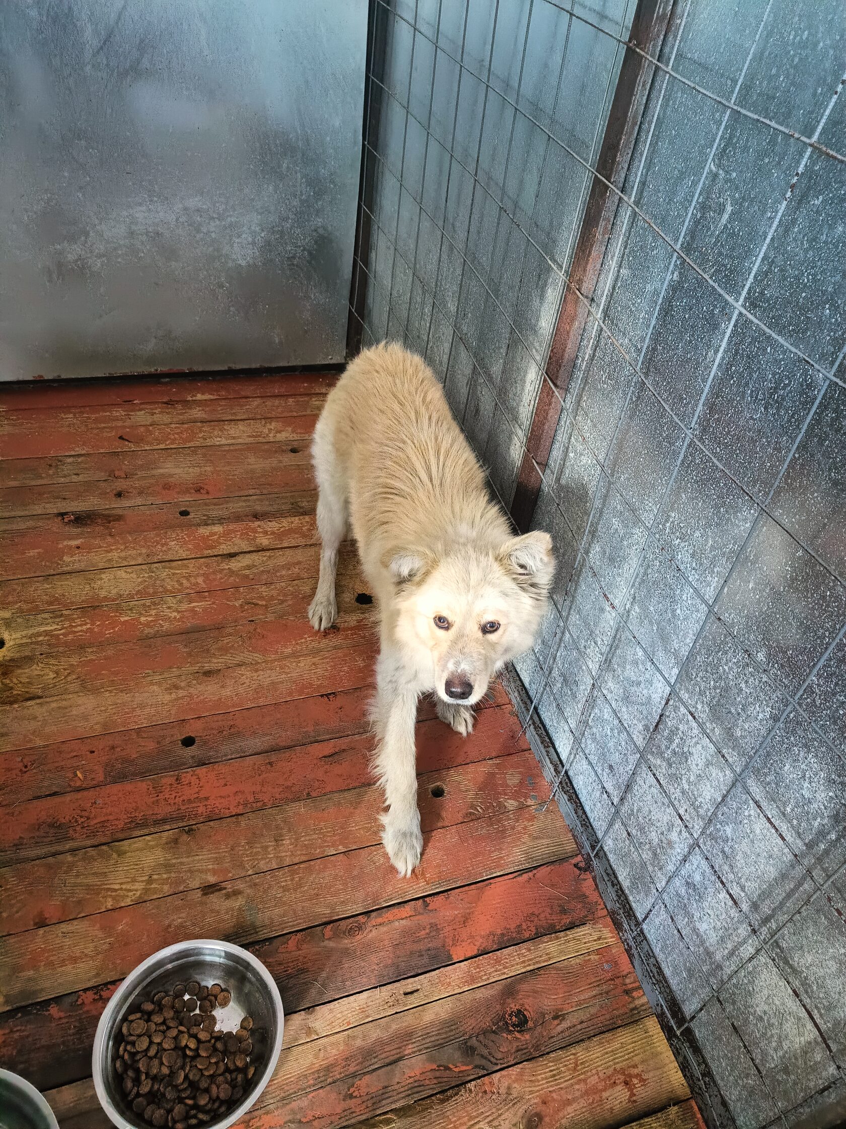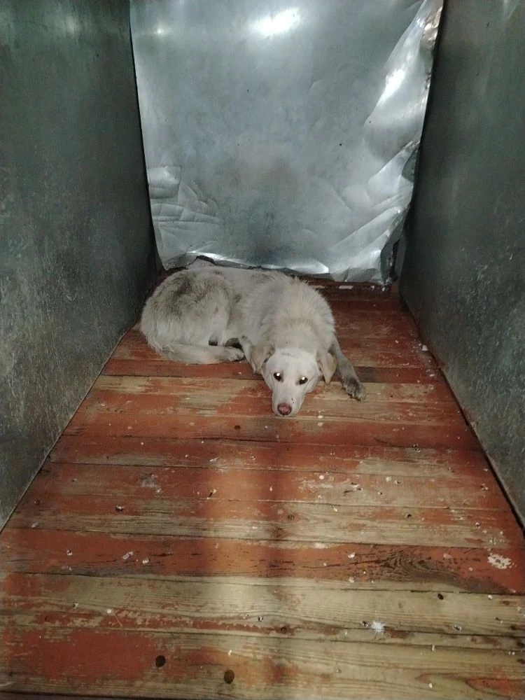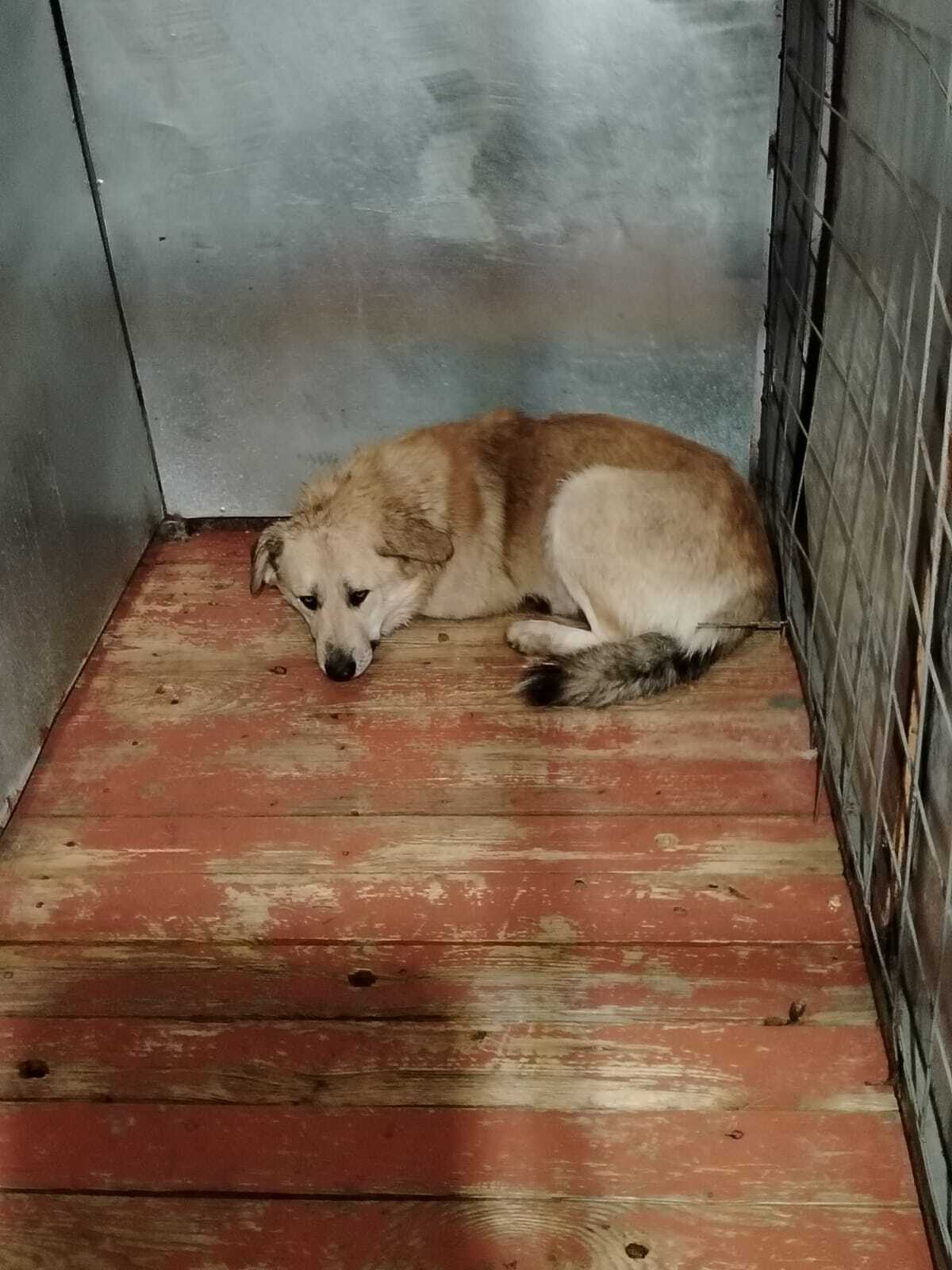 59.Сука, примерный возраст-2 года, окрас: бежевый с белым, шерсть гладкая, б/п, высота в холке 30см. Поступил в приют .29.11.2025 г. Выбыл из приюта 16.12.2025 г.